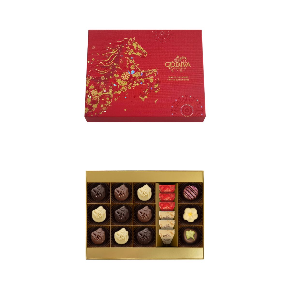 GODIVA巧克力大師以馬背上的GODIVA夫人為靈感,將這一優雅形象化為巧克力上的精緻浮雕,在致敬品牌創意精神的同時,寄予“馬到成功”的美好寓意。甄選黑巧克力、白巧克力與牛奶巧克力,巧妙融合焦糖的馥鬱、堅果的香濃與水果的清新等,漸次綻放多重風味,締造出兼具視覺美感與味覺享受的當代巧克力體驗。