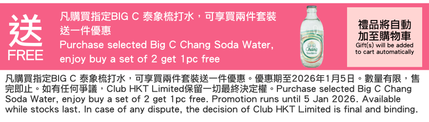 ![[電子禮券]Big C- 泰象 梳打水樽裝 325毫升 (2 件套裝)](https://shop.theclub.com.hk/media/catalog/product/cache/2fcb0be76f5f36e732067d937460935a/b/c/bc-8851994612012_1_1_1.jpg)