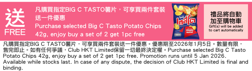 ![[電子禮券]Big C- Tasto 咖喱蟹味薯片 42克 (2件套裝)](https://shop.theclub.com.hk/media/catalog/product/cache/be17b97d69409caa72a0e4a210ce1812/b/c/bc-8851004406204_1_2.jpg)