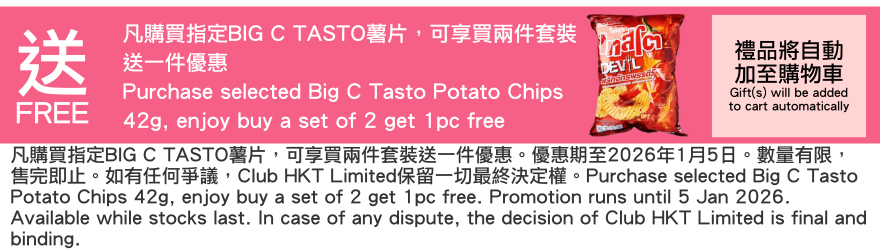 • 須於2026年3月31日前到Big C香港店鋪出示電子優惠劵,方可換領指定獎賞。
