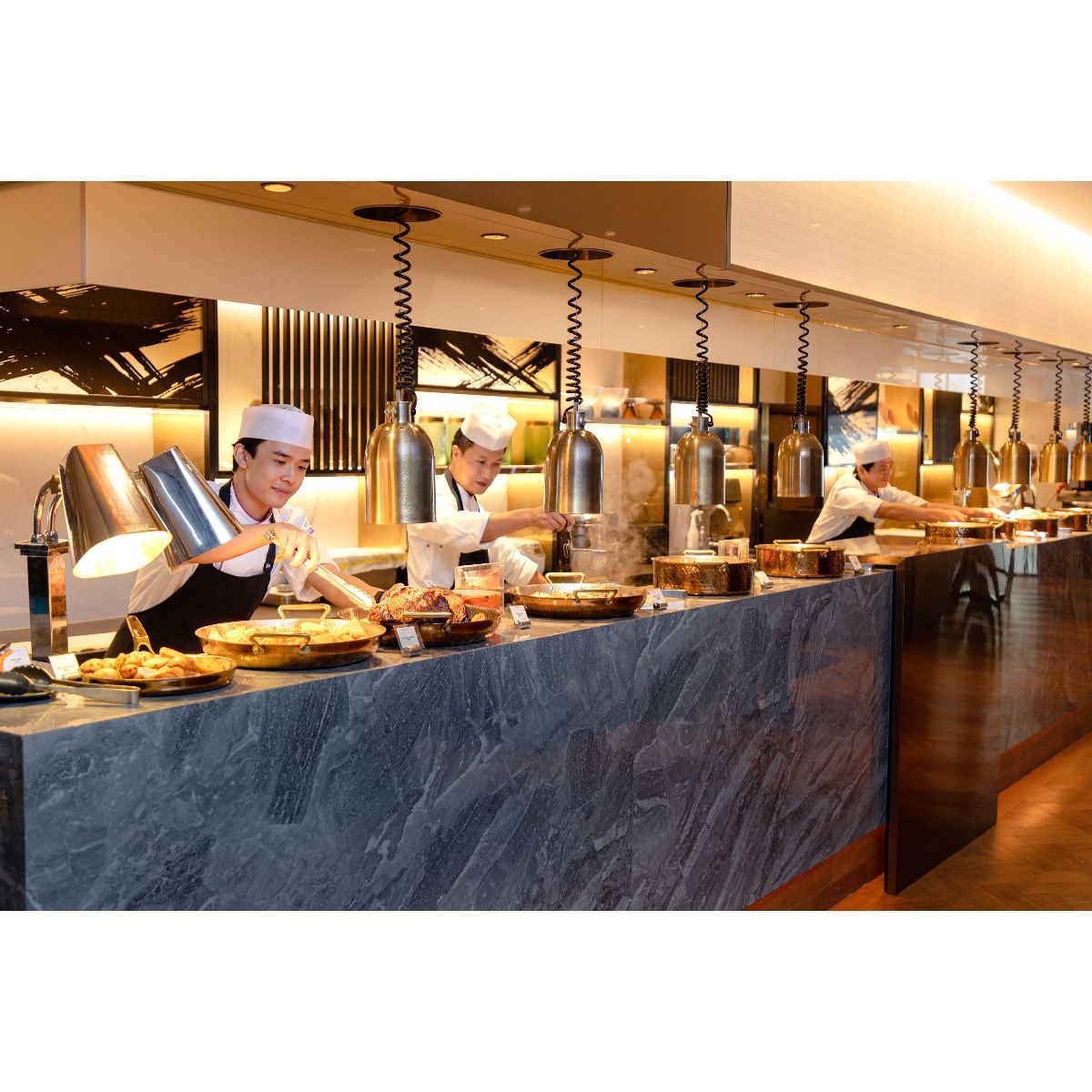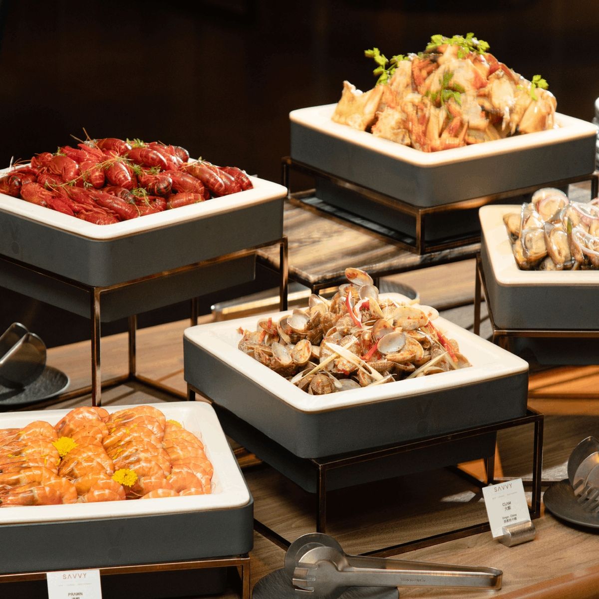 周末暢飲早午餐供應無限量的冰鎮海鮮、波士頓龍蝦、麵包蟹、小龍蝦、即席炮製各國熱葷等。食客更可近距離欣賞廚師團隊於開放式廚房即席炮製西式、印度、印尼、泰式及中式熱葷。