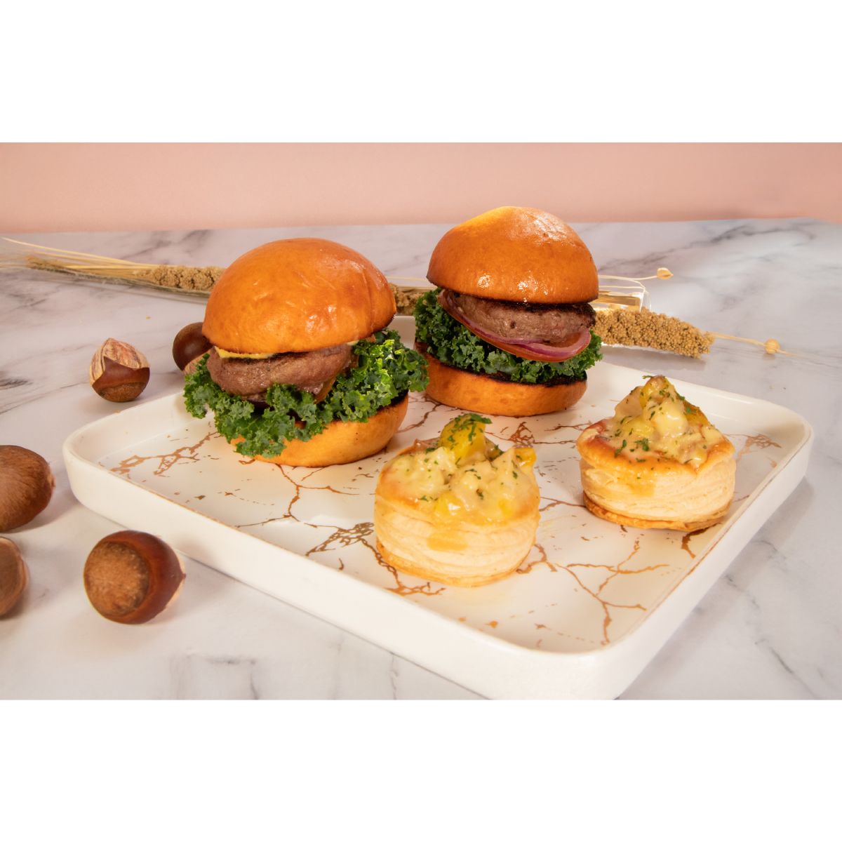 迷你飛驒和牛漢堡|日式清酒鮑魚伴白桃|法式干邑雞肉栗子酥盒|沙律醬蝦多士