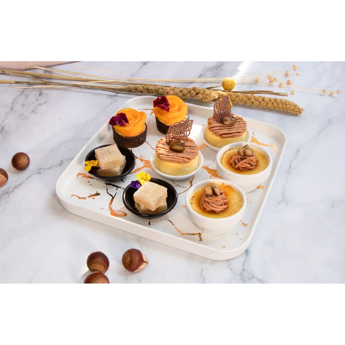 白葡萄酒蕨餅|自家製日本栗子餅|櫻桃酒栗子焦糖燉蛋 |香桃法式杏仁撻|英式鬆餅伴忌廉及果醬