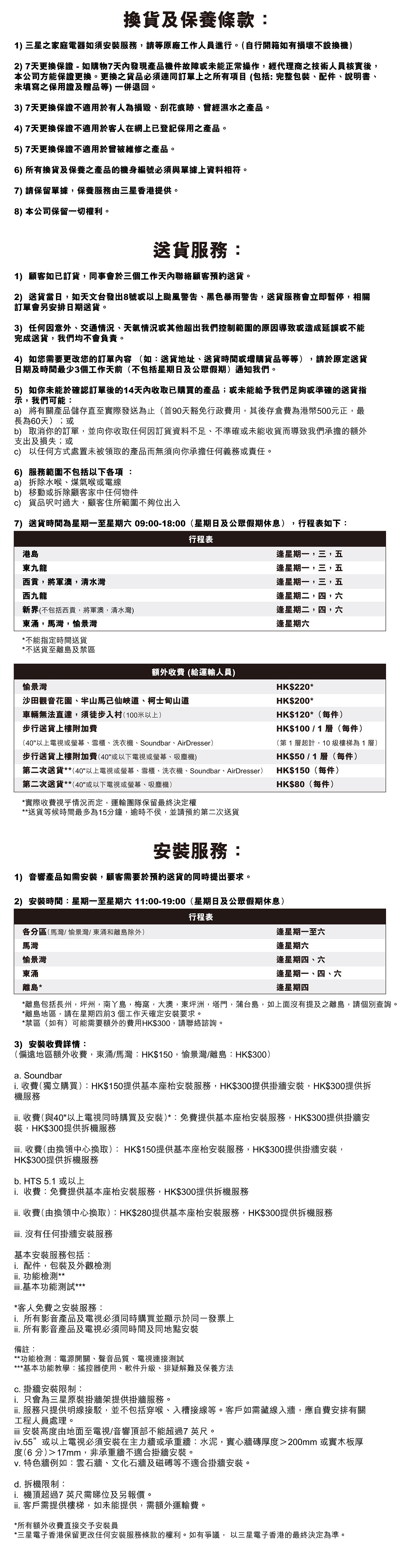 - 鏡像功能配合最新的Samsung智能手機及平板電腦效果更佳,唯具兼容性受不同流動裝置的型號、版本及鏡像功能(例如:AllShare Cast或螢幕鏡像)所限,請於購買時向Samsung營業代表查詢。