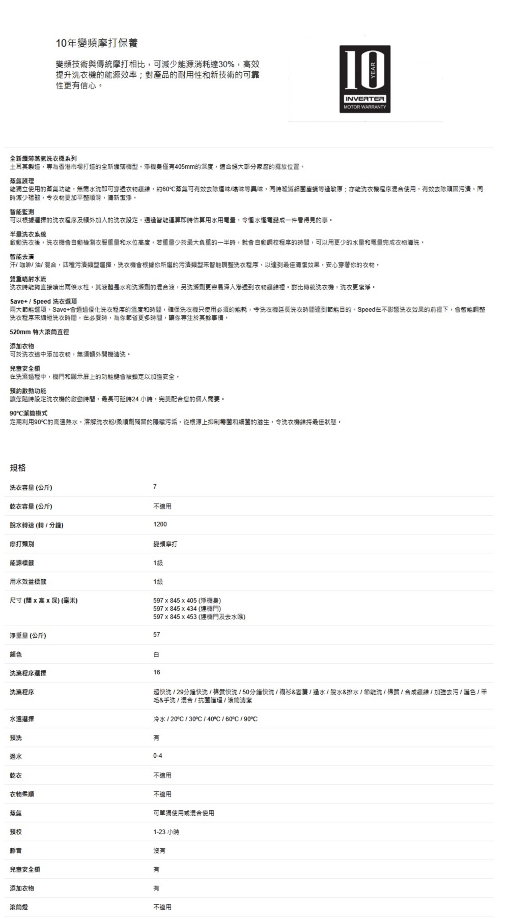 - 洗滌程序︰超快洗 / 29分鐘快洗 / 棉質快洗 / 50分鐘快洗 / 襯衫&窗簾 / 過水 / 脫水&排水 / 節能洗 / 棉質 / 合成纖維 / 加強去污 / 護色 / 羊毛&手洗 / 混合 / 抗菌護理 / 滾筒清潔