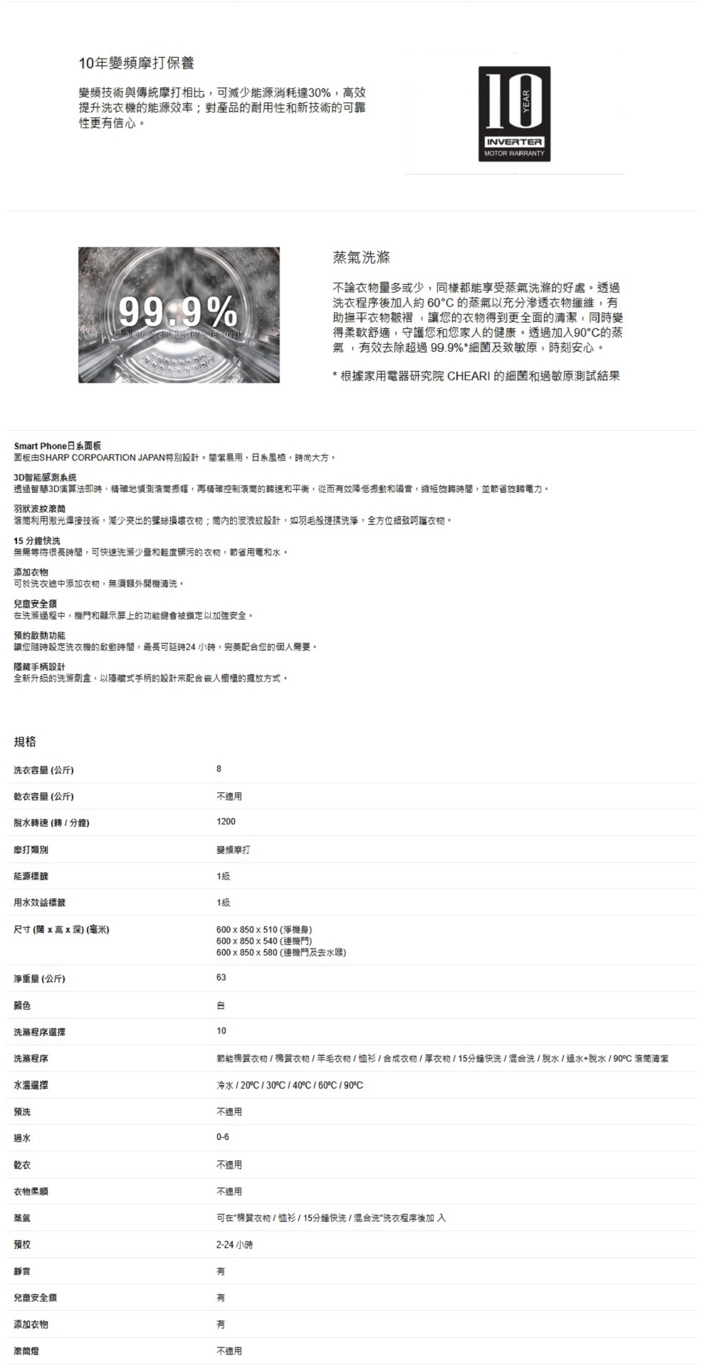 SHARP - 8公斤1200轉 纖薄型蒸氣前置式洗衣機 ES-FH8CH-W