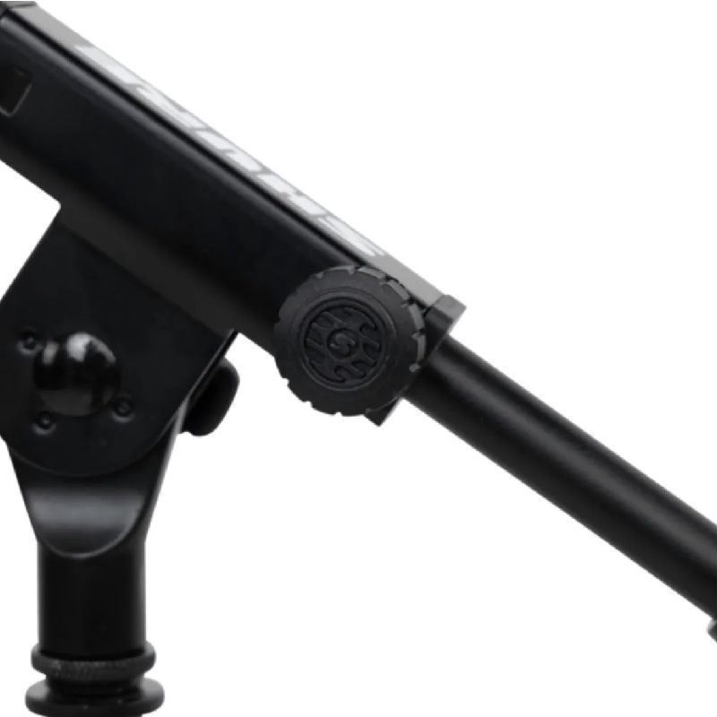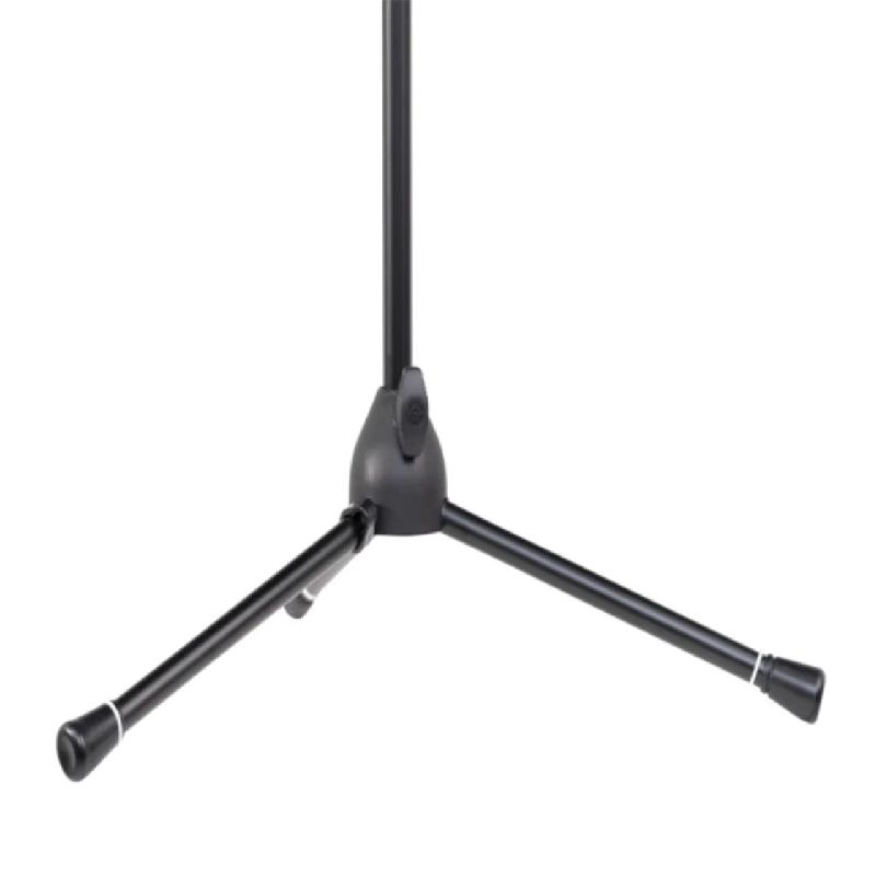 - 支架底部可折疊,並配有防滑橡膠腳墊,提供穩固的支撐。此外,腳墊上有白色安全邊條(可拆卸),增加可見性。整體使用黑色粉末塗層鋼材製造,堅固耐用,同時具備內建的線材管理夾,方便整理麥克風線路。