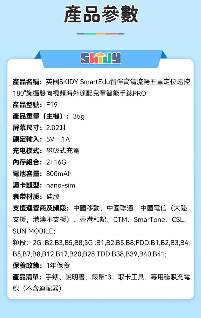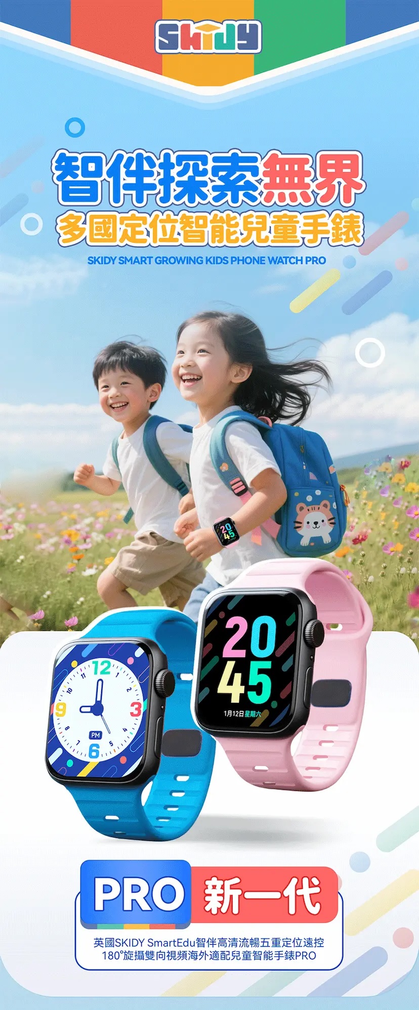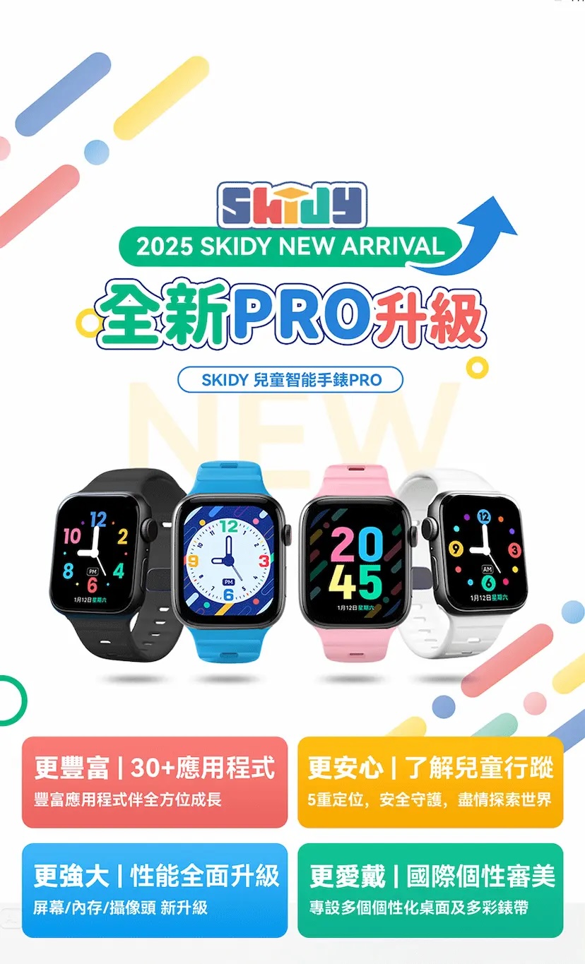 - 產品名稱:英國SKIDYSmartEdu智伴高清流暢五重定位遠控180°旋攝雙向視頻海外適配兒童智能手錶PRO