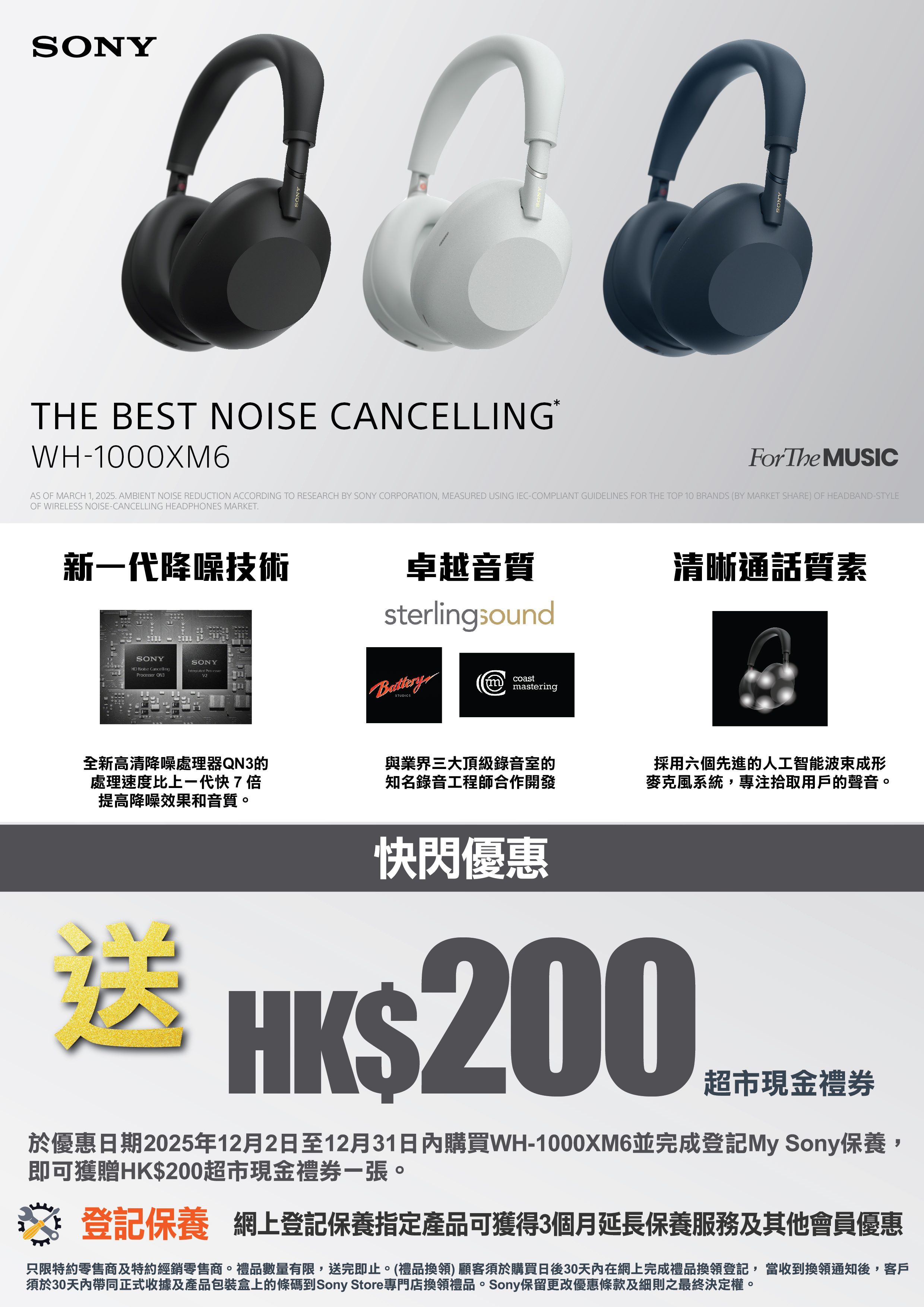 - 優惠期內於指定特約經銷零售商購買WH-1000XM6, SRS-ULT50, SRS-ULT70並完成登記My Sony保養,即可獲贈指定金額超市現金禮券。