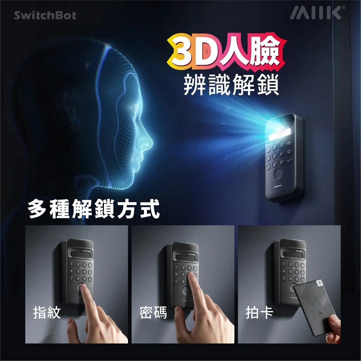 - 支援臉部、指紋、密碼、NFC、鑰匙、語音、App、藍牙及智能手錶解鎖。