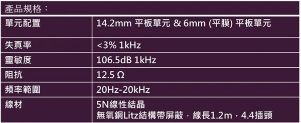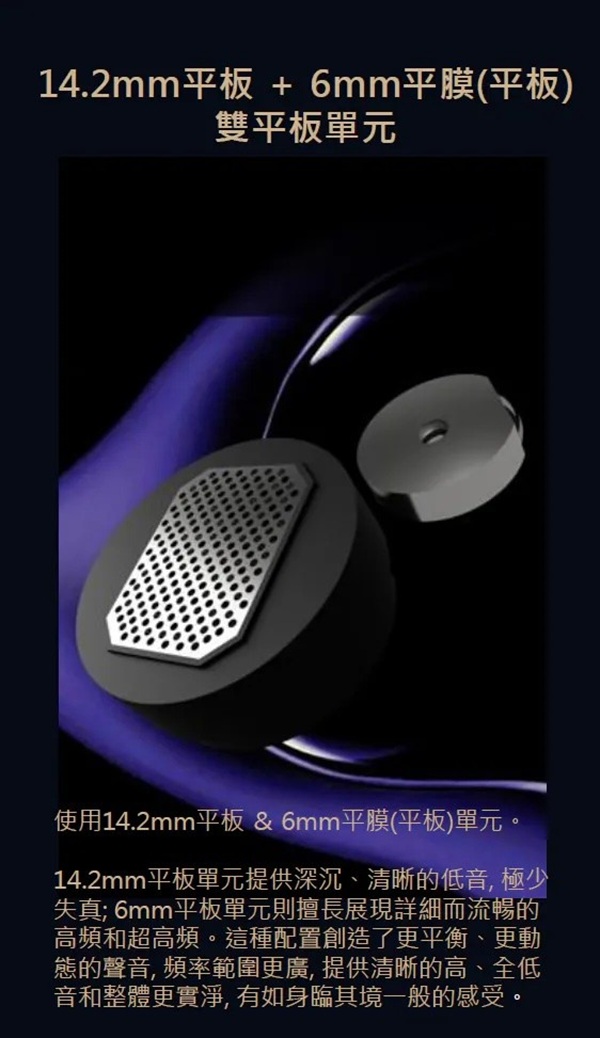 使用 14.2mm 和 6mm 平面驅動單元,結合兩者的優勢。14.2mm 驅動單元提供深沉、清晰的低音,並且失真度極低,而 6mm 驅動單元擅長再現細節豐富且順滑的高頻和超高頻。這種設置創造出更平衡、更動態的聲音,具有更廣的頻率範圍,提供清晰的高音、豐滿的低音,並帶來更身臨其境的聆聽體驗。