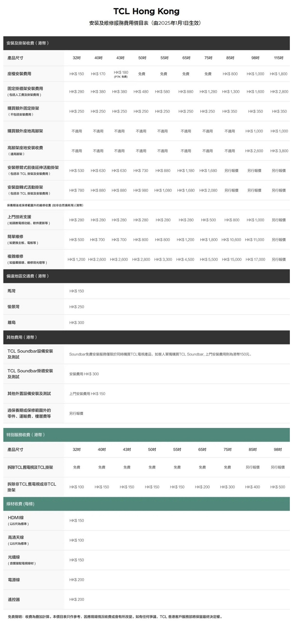 - 電視 / 影音產品安裝收費,維修服務詳情及其他細項收費,請自行參閱 TCL Hong Kong 安裝及維修服務費用價目表。