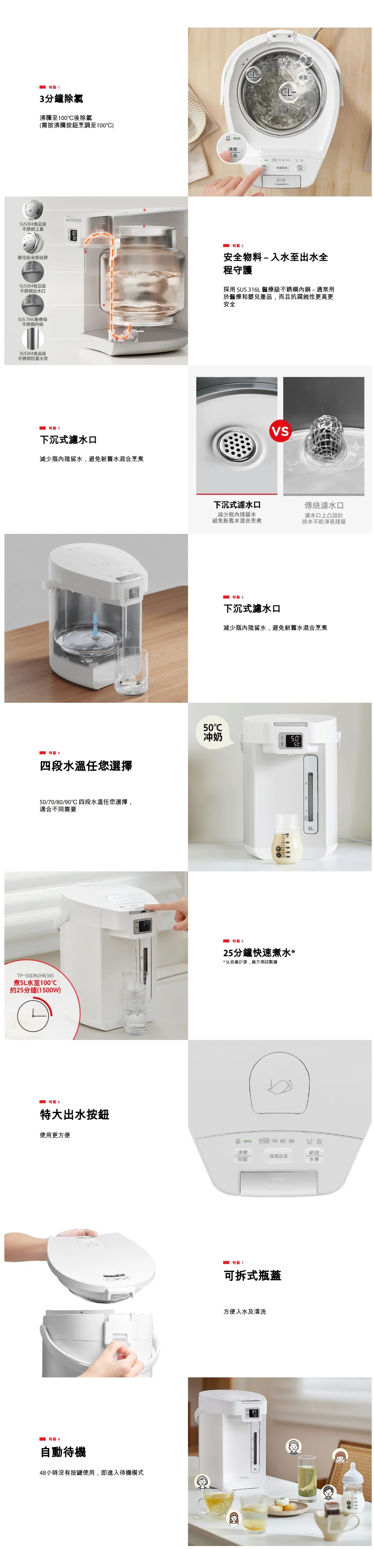 • 特設3分鐘加長沸騰時間,有效去除水中氯氣