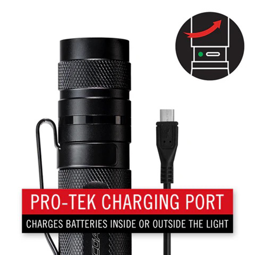 直接透過交流、直流和 USB 充電。帶有 COAST PRO-TEK 充電功能的手電筒和頭燈包括一個用於備用電源的直連連接埠。