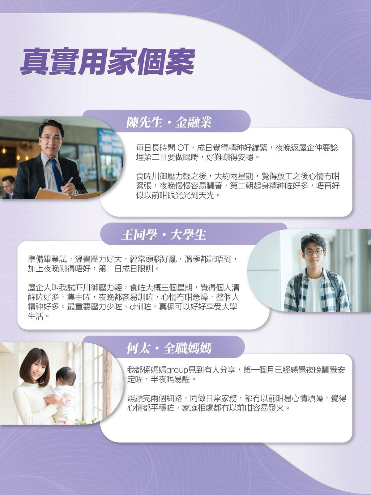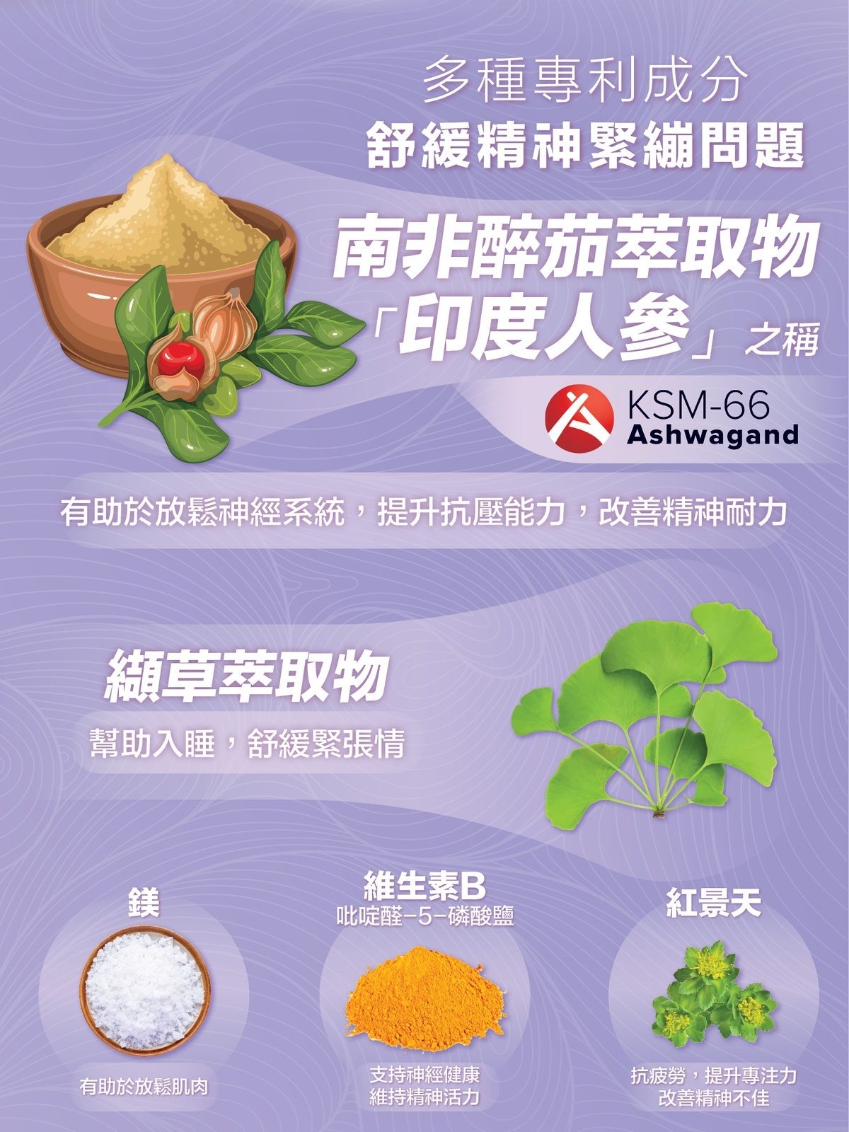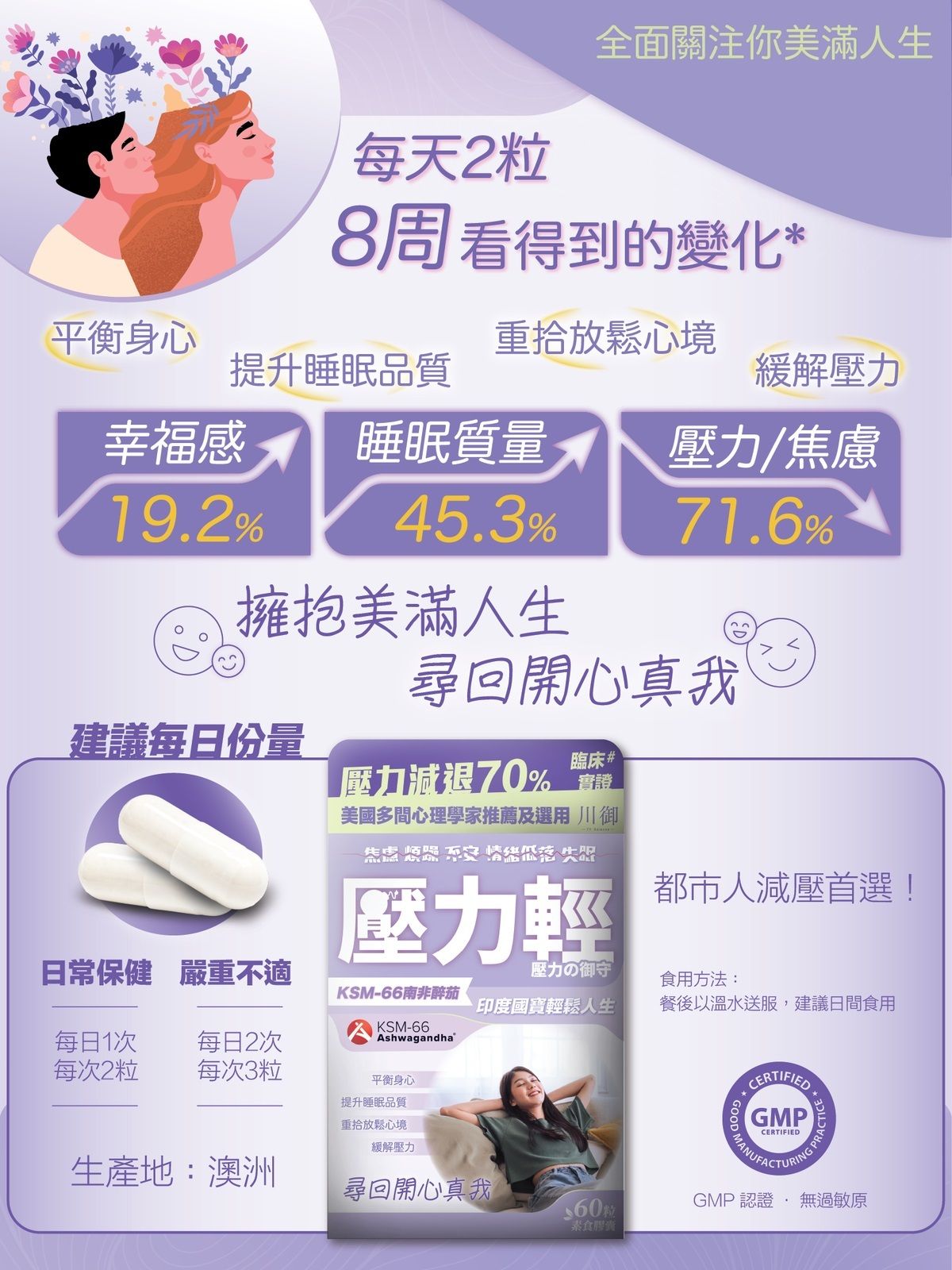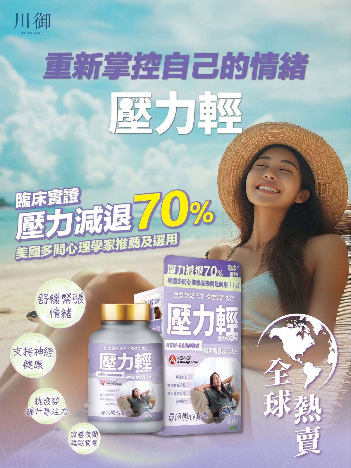 川御壓力輕是一款以舒緩壓力及使人平靜的天然草本營養品。主要專利成份KSM-66南非醉茄,成份天然,有印度人參之稱。鎮靜抗壓舒緩平靜功效受長久受美國都市人追捧。以專利浸漬法萃取技術提取最佳有效活性成份醉茄內酯,成份穩定且具高度水溶性,具安全性試驗,不含過敏原。