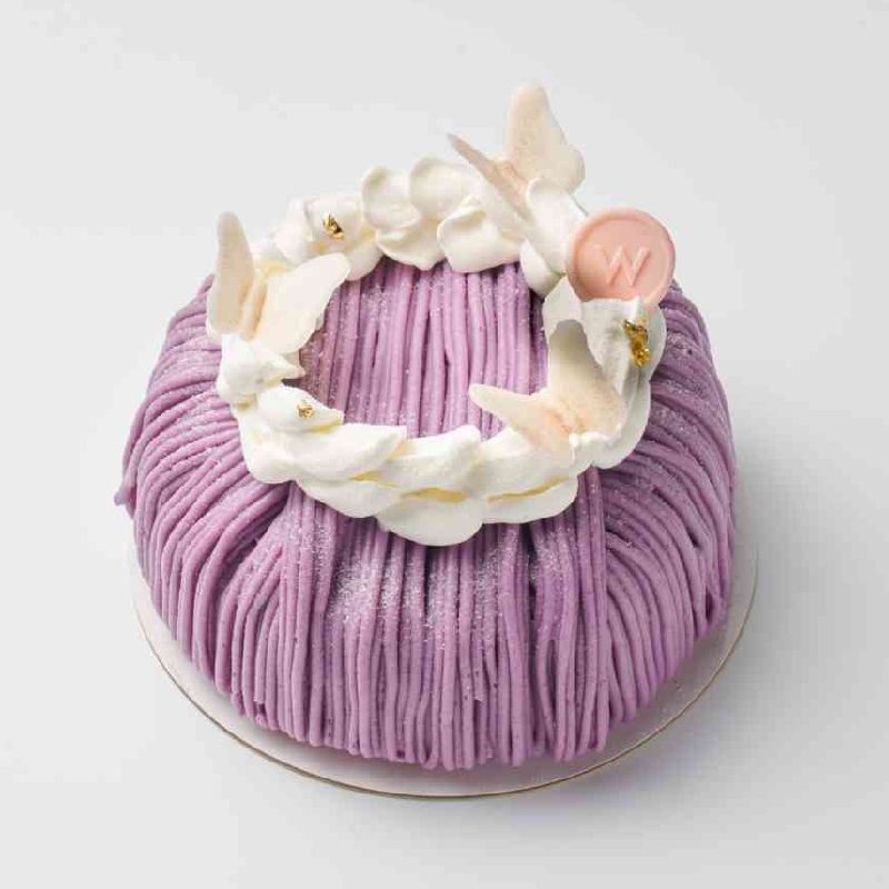 經典栗子蛋糕,結合甜蜜芋泥、煙韌麻糬、榛子奶油和栗子餅乾,完美化身成為感動味蕾的香芋天使。