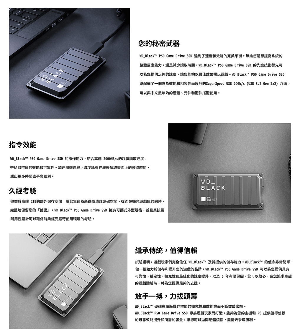 試驗證明,遊戲玩家們完全信任 WD_Black™ 及其提供的儲存能力。WD_Black™ 的使命非常簡單:做一個致力於儲存和提升您的遊戲的品牌。WD_Black™ P50 Game Drive SSD 可以為您提供具有可靠性、穩定性、擴充性和最佳化的速度提升,以及 5 年有限保固,您可以放心,在您追求卓越的遊戲體驗時,將為您提供足夠的支援。