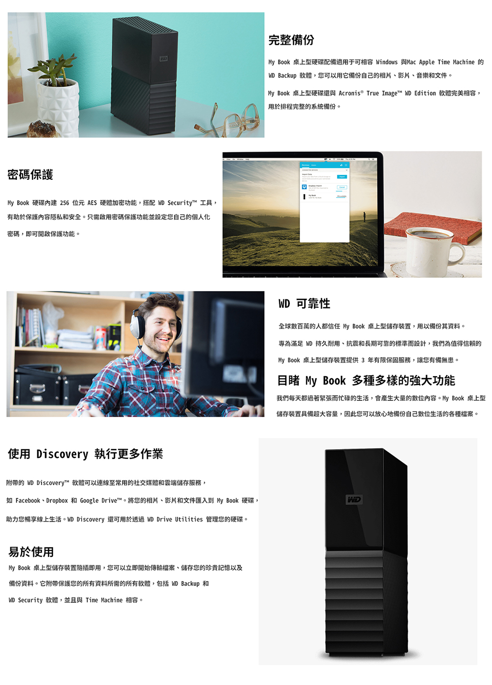 我們每天都過著緊張而忙碌的生活,會產生大量的數位內容。My Book 桌上型儲存裝置具備超大容量,因此您可以放心地備份自己數位生活的各種檔案。