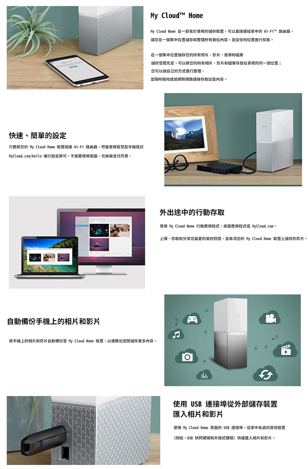 全新的 My Cloud Home 儲存裝置可以直接接入家中的 Wi-Fi 路由器,讓您在一個集中位置輕鬆儲存、整理和控制所有數位內容,並從任何位置進行無線存取。