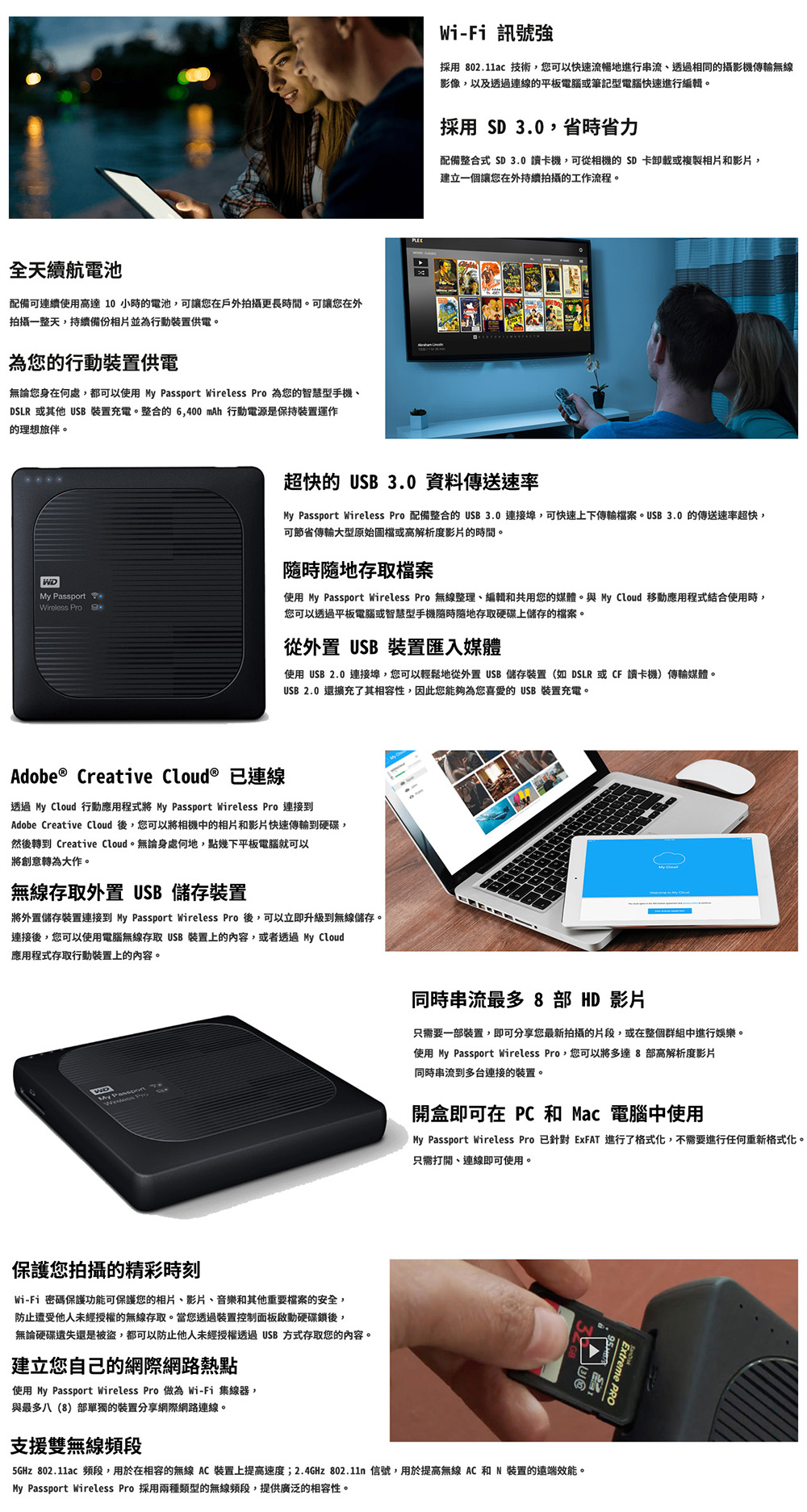 My Passport Wireless Pro 為戶外攝影師和攝像師提供可擕式儲存裝置,便於他們輕鬆卸載、編輯和串流相片或高解析度影片。經過專門設計,能夠與行動裝置無縫協作,並且內置 SD 讀卡機,為您帶來一款多功能硬碟,有效簡化您的工作流程。