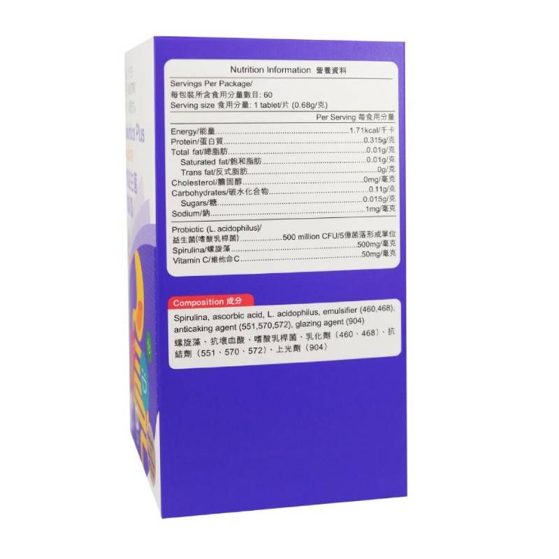 益生菌(嗜酸乳桿菌 LA-14)5億單位、螺旋藻500毫克
