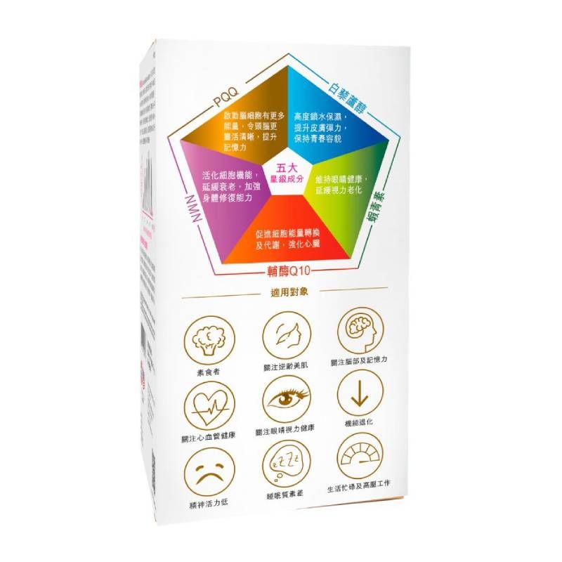 - PQQ – 啟動腦細胞有更多能量,令頭腦更靈活清晰,提升記憶力